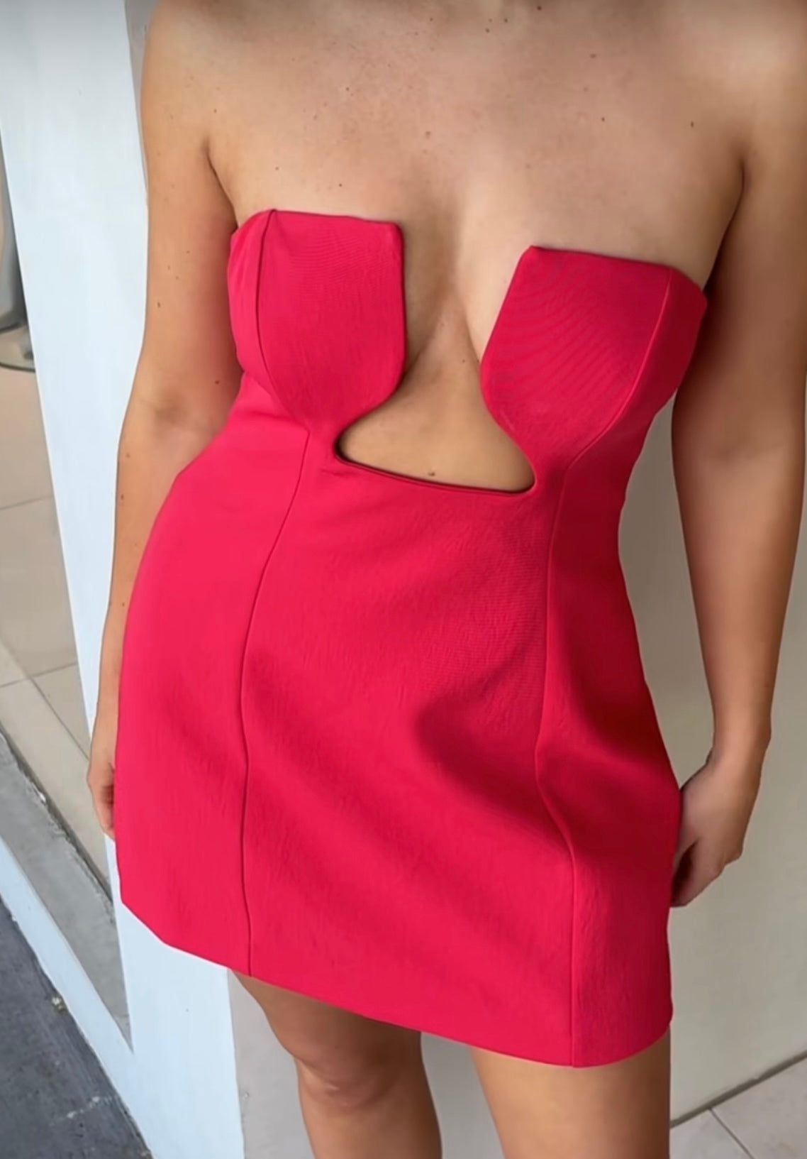 Make a bold statement in the sleek Ariel Low Cut Mini Dress in a striking Ruby colourway. Designed with a striking front cut-out detail, it blends modern edge with timeless elegance. The strapless neckline highlights the shoulders, while the structured silhouette flatters the figure for a confident, feminine look.