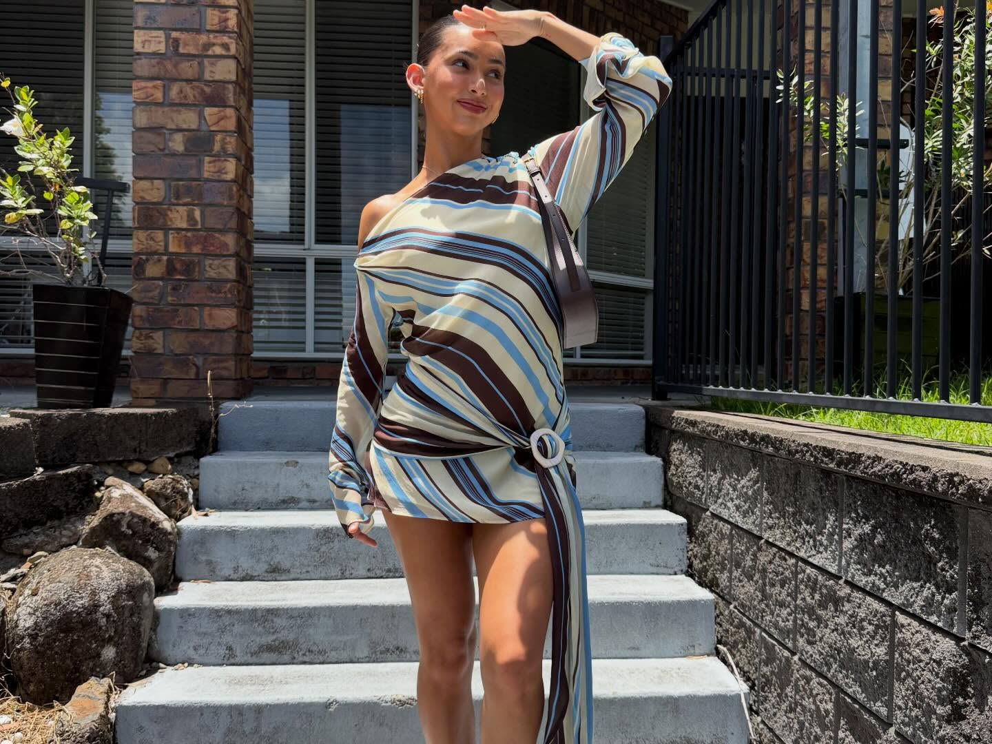 The Elise Mini Dress features a flowing one-shoulder silhouette with a long, flared sleeve. The layered mini skirt is finished with a sash detail at the hip, accented by a statement buckle for dimension.