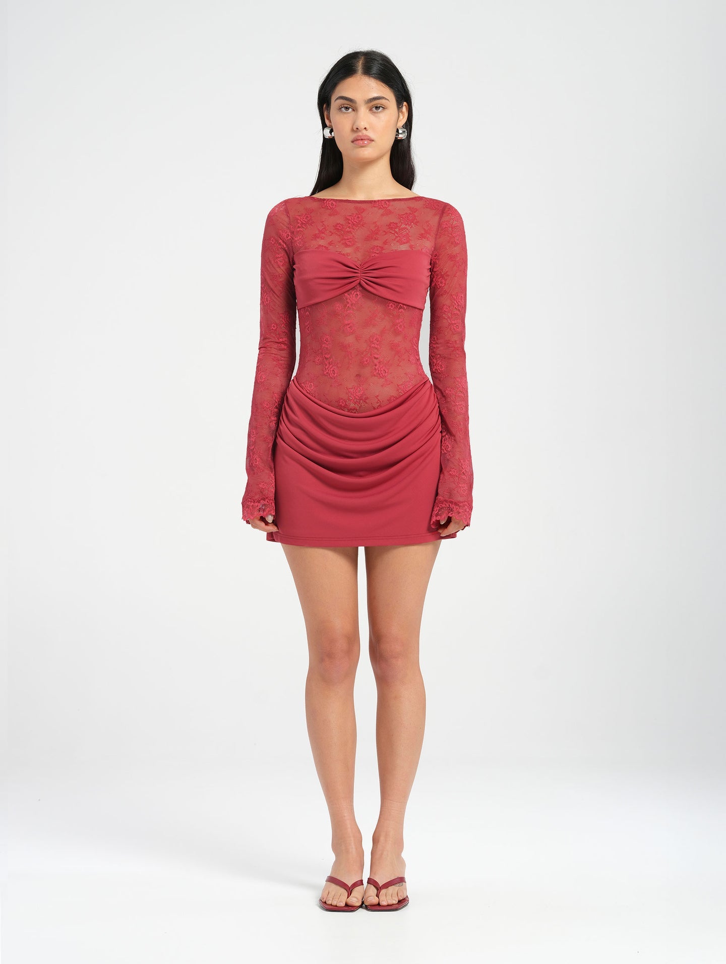 The Oskar Dress is a mini-length silhouette, thoughtfully crafted from delicate lace and buttery-soft jersey. Designed with a boat neckline and long lace sleeves, this versatile dress suits any occasion. The sheer lace bodice features an overlapped bralette for coverage, while the draped cowl mini skirt adds a quintessential BENNI touch.
